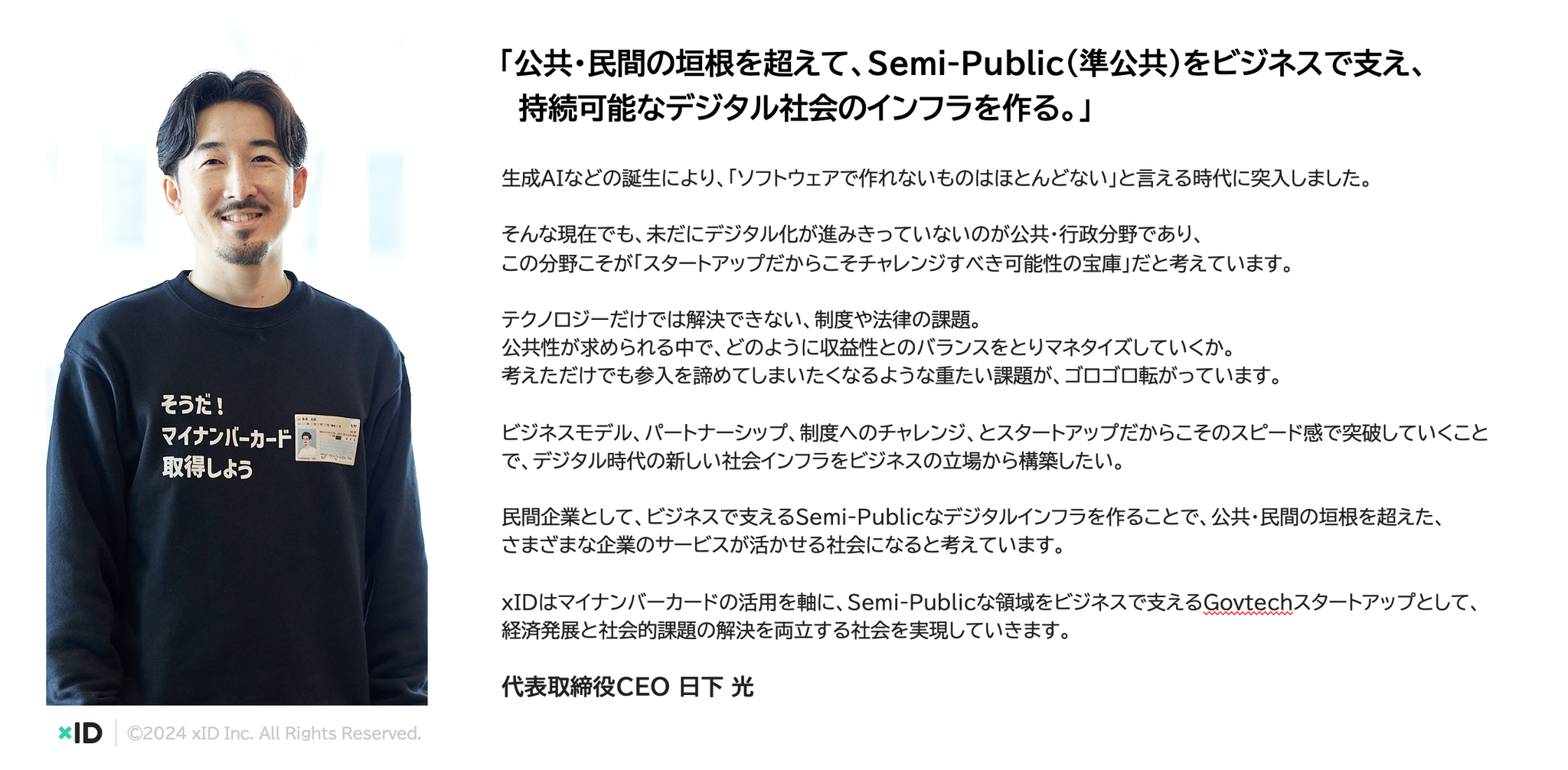 マイナンバーカードと連携したデジタルIDの普及を通じて、これまで交わることの難しかった官⺠や、企業間の境界線を溶かし、共創のきっかけを届けていく。そして、新たなかけ合わせから次世代の事業やサービスが続々と生まれ、人々の暮らしや経済活動がかつてないほどに大きく変わっていく。そんな、可能性あふれるデジタル国家を下支えする、唯一無二のインフラをつくっていきます。